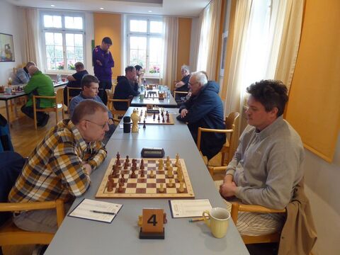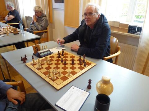 Insgeheim träumten wir nun sogar von einem Mannschaftssieg, denn Elmar an Brett 3 (Schwarz) hatte sich in ein vorteilhaftes Springerendspiel vorgearbeitet, während Winfried an Brett 2 (Weiß) einen Mehrbauern in Form eines gedeckten Freibauern besaß. Doch der schwarze Springer von Winfrieds Gegner wirbelte unglaublich behende zwischen Verteidigung und Angriff hin und her und komplizierte das vermeintliche Gewinnspiel. Sukzessive wurde aus der weißen eine schwarze Gewinnstellung, also doch wieder Rückstand 3:4 um 14:20 Uhr.