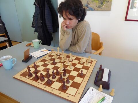Auch hier half wieder ein Youngster postwendend der Mannschaft aus der Patsche: Jatin trug an Brett 8 mit den weißen Steinen einen mustergültigen Angriff vor, den Schwarz auch durch ein Qualitätsopfer nur vorübergehend zu besänftigen vermochte. Zwei weiße Türme in der g-Linie kosteten die schwarze Dame. 2:2 um 13:35 Uhr.