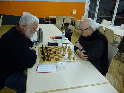 Hans (Brett 4, Schwarz) stand hingegen bald gedrückt, besonders ein unvertreibbarer weißer Läufer auf d6 engte das schwarze Spiel ein. Nach langer, zäher Verteidigung musste sich der Nachziehende schließlich ins Schicksal fügen. Nur noch 2:1.