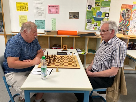 Denn auch an den drei übrigen Brettern herrschte Hochbetrieb. Elmar ging an Brett 2 (Weiß) aus seiner bewährten positionellen Statik in einen taktischen Schlagabtausch mit vermeintlichem Bauerngewinn über, war dann aber schnell froh, dass sein temposchluckender Ausflug in fremdes Terrain nur zum Rückverlust des Bauern führte. Mit dem Friedensschluss waren beide Seite gern einverstanden. 1,5:0,5.