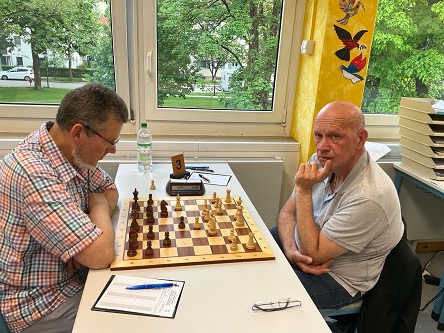 Am längsten kämpfte wieder Christoph mit den schwarzen Steinen am Spitzenbrett. Sein Gegner überließ ihm gleich in der Eröffnung das Läuferpaar für einen Doppelbauern, aber die schwarze Dame legte sich früh am Königsflügel fest und war mangels Mobilität schließlich froh um Abtausch. Das resultierende Turmendspiel war nur scheinbar elementar, bot noch einige Stolperfallen für Weiß, weil der schwarze König weiter vorgedrungen war. Aber schlussendlich mündete die Partie in eine Zugwiederholung, die Christoph umso leichter fiel, als der knappe Mannschaftssieg feststand --- 2,5:1,5.