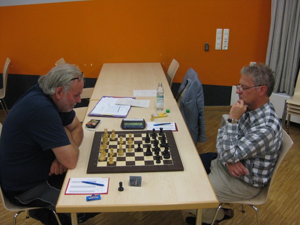Am Spitzenbrett konnte Christoph (Weiß) eine leicht bessere Stellung herausspielen und diesen Vorteil praktisch bis zur Zeitkontrolle behalten. Kurz davor war die Entscheidung gefallen: Der Gegner unterschätzte Christophs Freibauer in der Mitte und konnte diesen plötzlich nicht mehr mit vernünftigen Mitteln vom Marsch zur Grundreihe aufhalten. 1:0