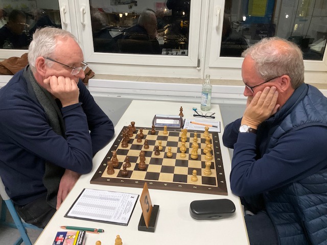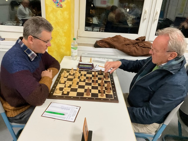 Elmar führte die schwarzen Steine an Brett 3, schaltete und waltete aber scheinbar nach Belieben. Ein schwarzer Springer fuhrwerkte am Damenflügel, ein schwarzer Freibauer am Königsflügel. Verständlich, dass Weiß die Partie abhakte. 1,5:0,5.