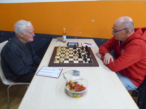 Im Spiellokal angekommen, erfuhren wir, dass Helmuts Gegner am Spitzenbrett ausfallen würde. Abgesehen von Helmuts zweckloser Anreise würdigten wir durchaus den Vorteil, mit einem Punkt Vorsprung ins Rennen zu gehen.
