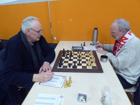 An Brett 3 erhielt Manfred (Weiß) gleich in der Eröffnungsphase ein Remisangebot, wollte aber gern weiterspielen. Wie es so geht, verlor er kurz danach einen Bauern. Damenendspiele können trotzdem endlos sein, abkürzenderweise unterlief ihm aber ein fataler Fingerfehler, der die angegriffene Dame stehen ließ. 2:1 für die Gastgeber.