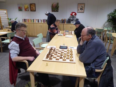 Brett 3, Weiß: Mit der elektronischen Uhr auf Kriegsfuß steht nach wie vor unser Nesto(h)r Manfred. Wenn seine Uhr fünf Minuten anzeigt, meint er felsenfest, er habe erst fünf Minuten verbraucht. Nach weiteren zehn Minuten sahen dies sein Gegner und der herbeigerufene Schiedsrichter naturgemäß anders. Also 1,5:0,5 für die Gastgeber.