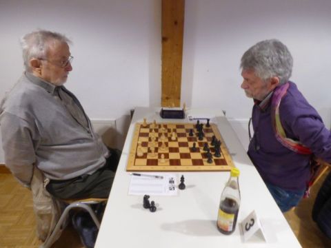Gernot ist in der Form seines Lebens, wurde an Brett 4 (Schwarz) nur durch Blitzgeräusche von Nachbarbrettern gestört. Trotzdem schaffte er es in einem Turmendspiel, in der a-Linie einen Freibauern zu bilden und dem Gegner einen Doppelbauern in der g-Linie anzuhängen. Durch jugendlichen Leichtsinn verlor er aber einen Bauern am Königsflügel zurück und willigte schließlich in sein drittes Remis der Saison ein. Der 3,5:0,5-Auswärtssieg war üppig genug.
